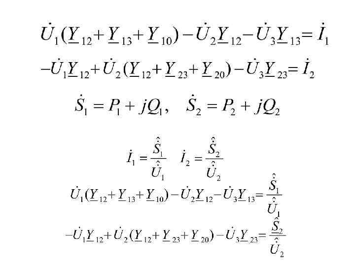 Если рассчитываемая схема имеет n узлов, то она описывается (n – 1) уравнением в комплексной форме и 2(n – 1) уравнениями в действительной форме. Режим электрической сети будет полностью определен, если в каждом узле известны вещественная и мнимая составляющие напряжения (или модуль и фаза напряжения) и активная и реактивная мощности.