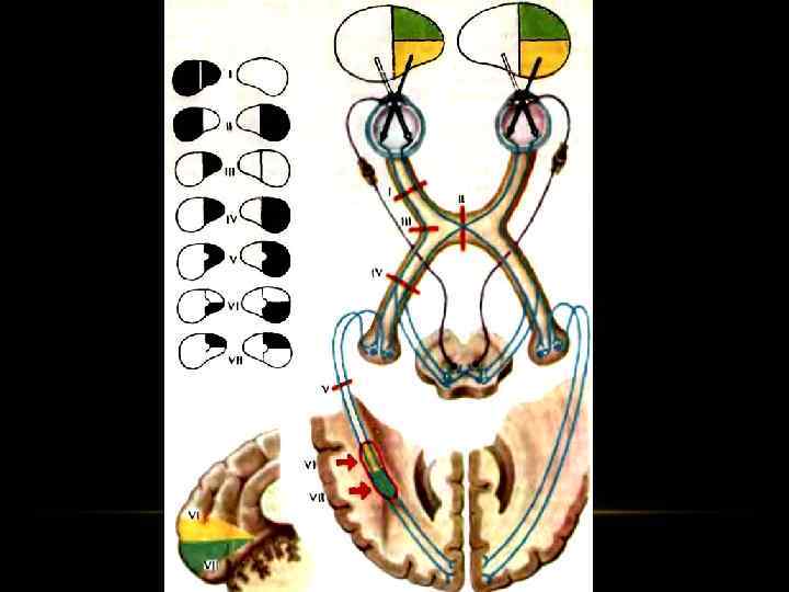 НАРУШЕНИЕ ФУНКЦИИ ЗРИТЕЛЬНОГО НЕРВА • Амавроз: полный перерыв проводимости зрительного нерва с развитием слепоты пораженного глаза • Амблиопия: Понижение зрения • Скотома: поражение только части волокон зрительного нерва (выпадение полей зрения секторами или островками. • Гемианопсия: Двухстороннее выпадение полей зрения: 1. Гомонимная гемианопсия 2. Гетеронимная биназальная гемианопсия 3. Гетеронимная битемпоральная гемианопсия