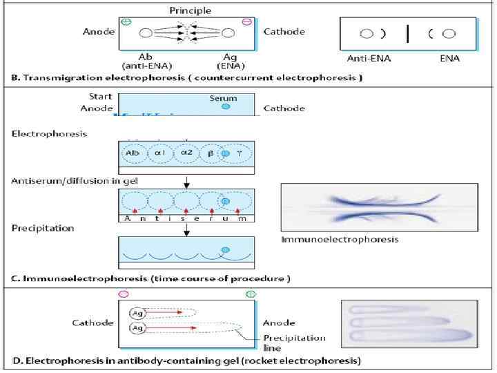 Иммуноэлектрофорез. позволяет оценить лишь качественный состав исследуемой смеси белков, применяется для выявления и характеристики мон. АТ . электрофорез Зональный электрофорез — полуколичественный метод, позволяющий разделить смесь белков в зависимости от их молекулярной массы и электрического заряда. Электрофорез с иммунофиксацией Основан на электрофоретическом разделении белков сыворотки в геле с последующей инкубацией геля в присутствии антител к тяжелым и легким цепям иммуноглобулинов. Применяется в сочетании с иммуноэлектрофорезом для определения моноклональных или олигоклональных иммуноглобулинов