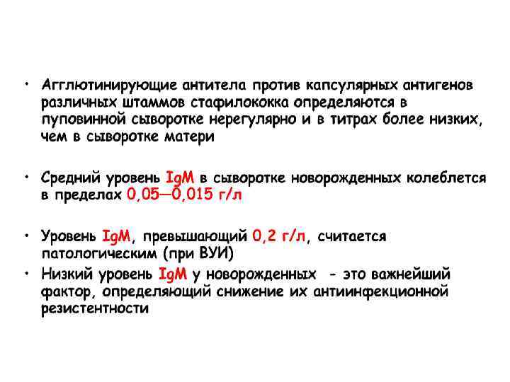 сниженная воспалительная реакция и миграция лейкоцитов Врожденный иммунитет недостаток опсонинов и хемотаксических факторов сниженный уровень комплемента СНИЖЕННАЯ РЕЗИСТЕНТНОСТЬ НОВОРОЖДЕННЫХ К НЕКОТОРЫМ ИНФЕКЦИЯМ дефект эффекторных функций Тлимфоцитов (цитотоксичность) резко сниженный уровень Ig. M Адаптивный иммунитет недостаток антител, которые трансплацентарно не переносятся