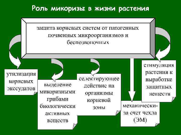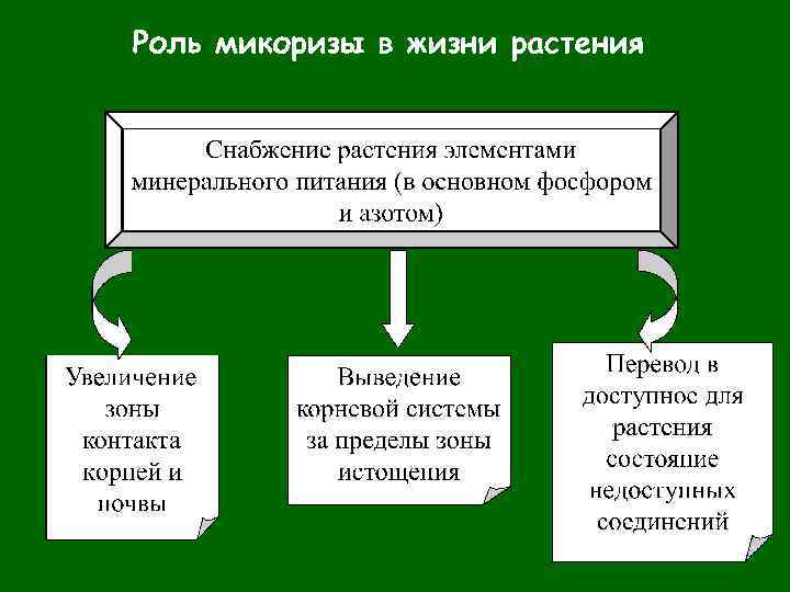Микориза – эволюционно сложившийся структурно оформленный симбиоз, необходимый для одного или обоих партнеров, между грибом и корнем (или иным контактирующим с субстратом и осуществляющим транспорт веществ органом) живого растения. Микоризы развиваются в специализированных органах растений, где тесный контакт между симбионтами является результатом синхронного развития. Микоризные симбиозы представляют собой континуум от мутуалистических до паразитических взаимоотношений, и положение в нем определяется видовой принадлежностью симбионтов, факторами окружающей среды и возрастной стадией симбиоза.