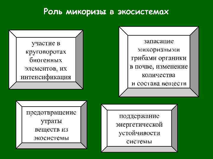 Типы микориз Эктомикориза • Образуют: около 6 тыс. видов грибов (преимущественно Агарикоидные, отд. Basidiomycota, реже представители отд. Ascomycota ), часто cпецифичные к хозяину около 5 -6 тыс. видов растений, почти исключительно древесных или кустарников. • Преобладают в лесах умеренной зоны с выраженной сезонностью и высоким содержанием органики в почвах.