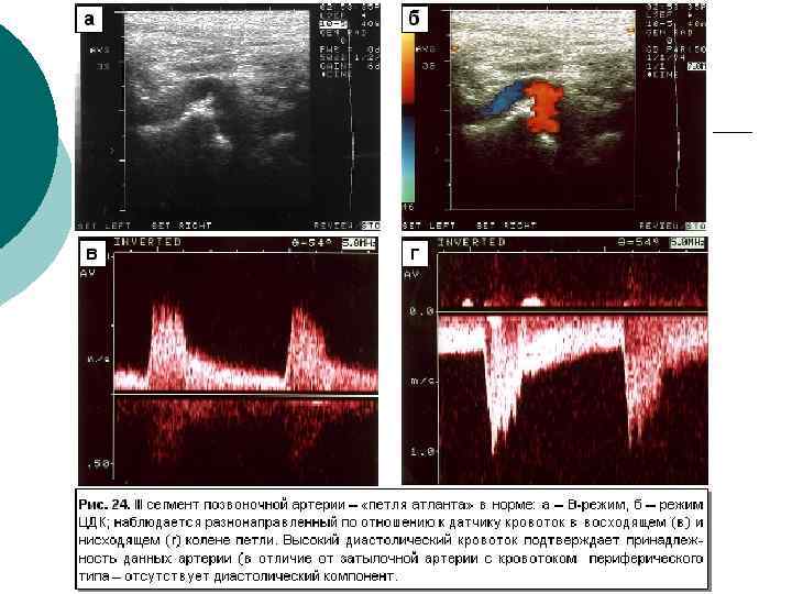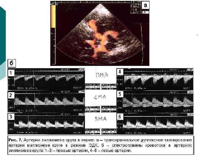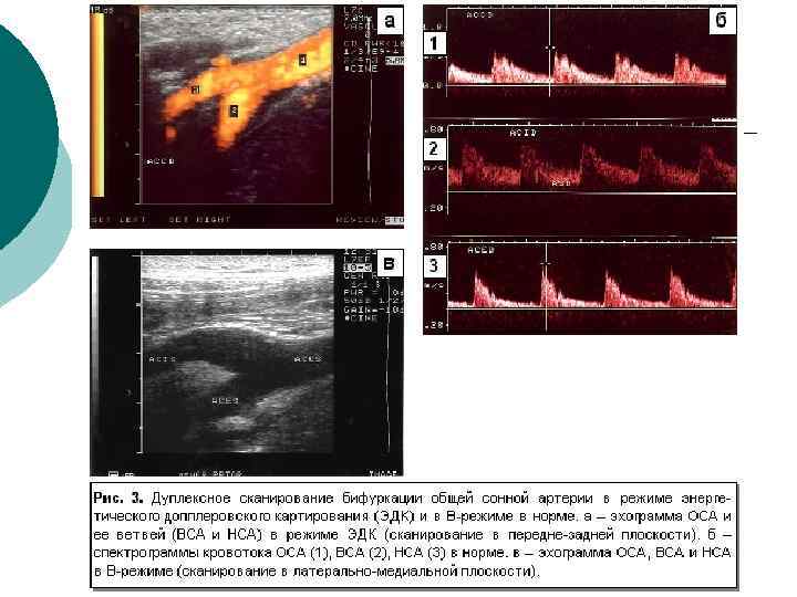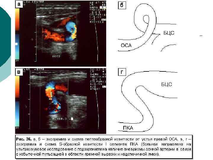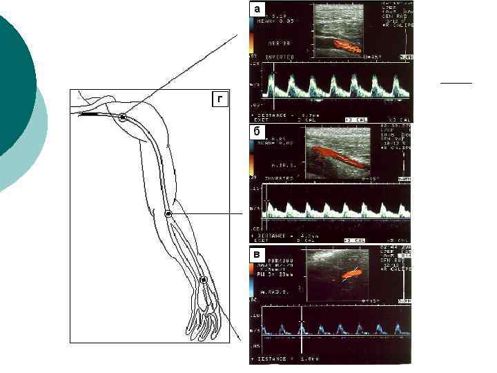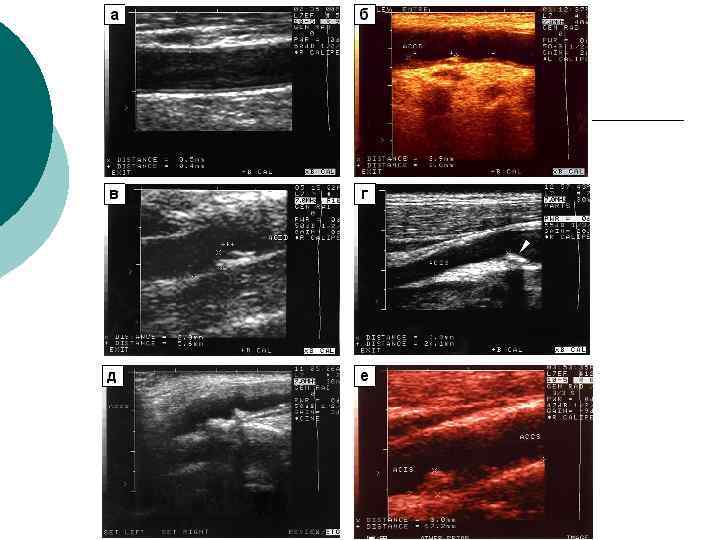 Диагностическая информативность ¡ ¡ ¡ Размеры артерий и вен; Скорости и характер движения крови; Толщина комплекса интима-медия (в норме – до 0, 8 мм в ОСА), наличие бляшек; Наличие извитостей, аневризм и стеноза артерий; Наличие тромбов, перфорантных вен при варикозной болезни, регургитации на клапанах Аномалии развития артерио-венозного русла