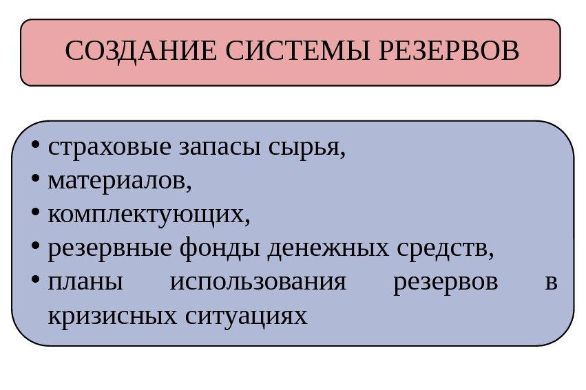 СОЗДАНИЕ СИСТЕМЫ РЕЗЕРВОВ • страховые запасы сырья, • материалов, • комплектующих, • резервные фонды денежных средств, • планы использования резервов в кризисных ситуациях