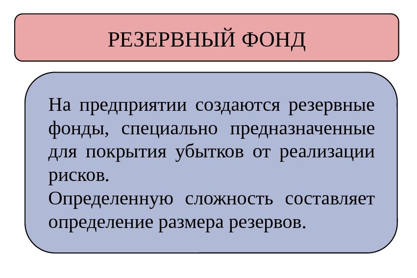 На предприятии создаются резервные фонды, специально предназначенные для покрытия убытков от реализации рисков. Определенную сложность составляет определение размера резервов. РЕЗЕРВНЫЙ ФОНД