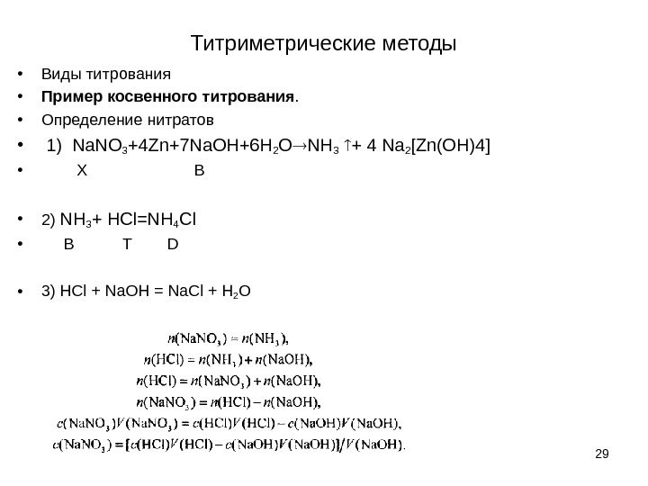 Титриметрические методы • Виды титрования • Пример косвенного титрования. • Определение нитратов • 1) Na. NO 3 +4 Zn+7 Na. OH+6 H 2 O NH 3 + 4 Na 2 [Zn(OH)4] • X B • 2) NH 3 + НС l=NH 4 Cl • B T D • 3) НС l + Na. OH = Na. Cl + H 2 O
