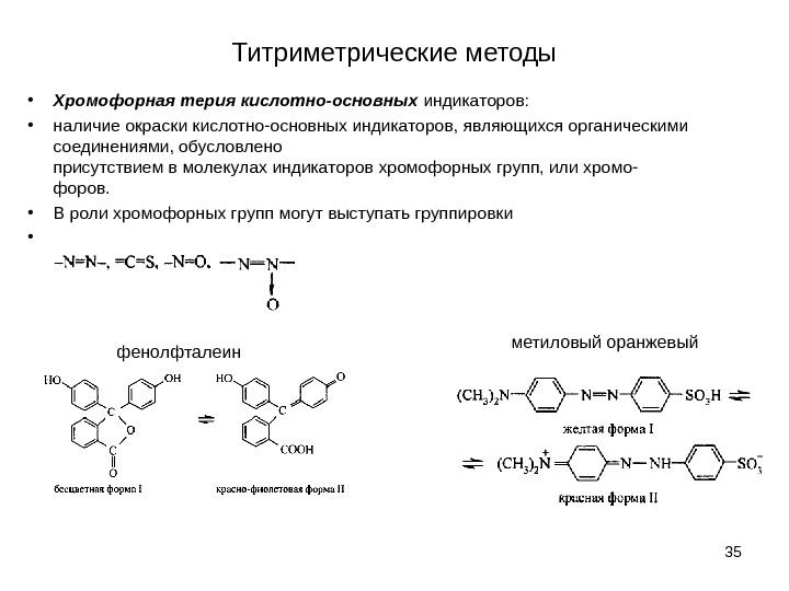 Титриметрические методы • Хромофорная терия кислотно-основных индикаторов: • наличие окраски кислотно-основных индикаторов, являющихся органическими соединениями, обусловлено присутствием в молекулах индикаторов хромофорных групп, или хромо- форов. • В роли хромофорных групп могут выступать группировки • 35 фенолфталеин метиловый оранжевый