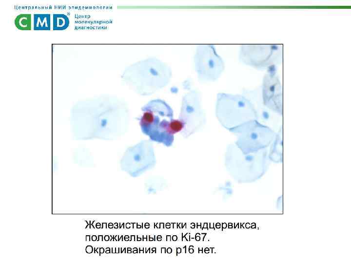 Назначение «ВПЧ-ПАП-тест + коэкспрессия p 16 INK 4 a/Ki-67» В лаборатории CMD «Коэкспрессия онкобелков p 16/Ki 67» выполняется в случаях: • ВПЧ-тест – позитивный (любой тип), ПАП-тест – ≥ ASCUS (ASCUS/ASC-H/L-SIL/H-SIL) • ВПЧ-тест – 16/18/45, ПАП-тест - NILM • ВПЧ-тест – негативный, ПАП-тест ≥ H-SIL Также тест может быть использован при: • Несоответствии результатов цитологии и гистологии, если материал забирали для жидкостной цитологии