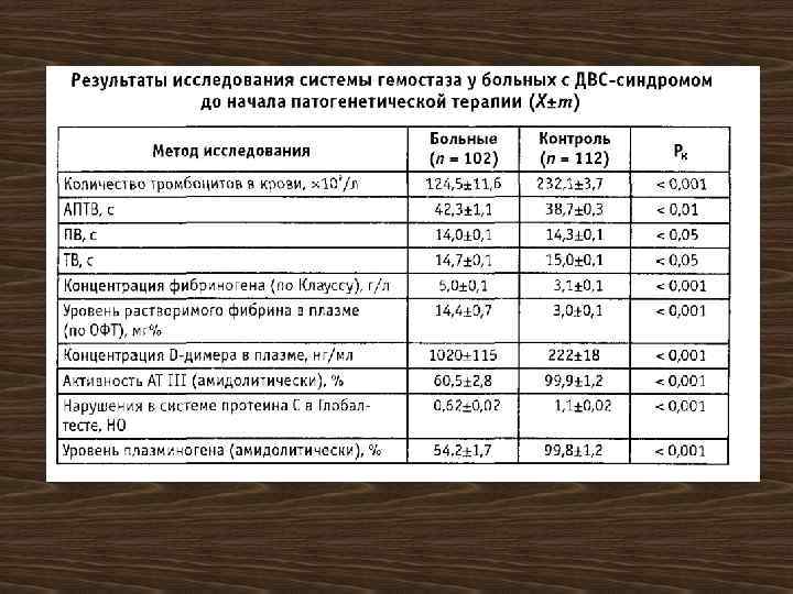 Контроль за тромболитической терапией Основной метод Рекомендуемые значения Концентрация фибриногена Более 1, 0 г/л* ТВ Увеличение** Уровень D-димера в плазме Свыше 500 нг/мл*** Концентрация плазминогена Не менее 65%**** Анализ кала на скрытую кровь Отрицательный Примечания: * - Падение фибриногена до уровня менее 1, 0 г/л способствует риску кровотечения ** - Связано с гипофибриногенемией и влиянием продуктов фибринолиза и фибирногенолиза на преобразование фибриногена в фибрин *** - Маркер интенсивности лизиса стабилизированного фибрина **** - Назначение фибринолитиков малоэффективно при выраженном снижении концентрации плазминогена