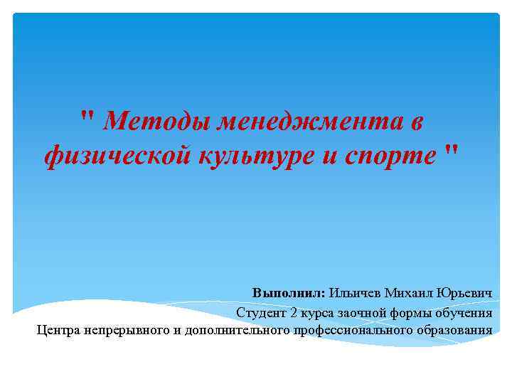 " Методы менеджмента в физической культуре и спорте " Выполнил: Ильичев Михаил Юрьевич Студент 2 курса заочной формы обучения Центра непрерывного и дополнительного профессионального образования