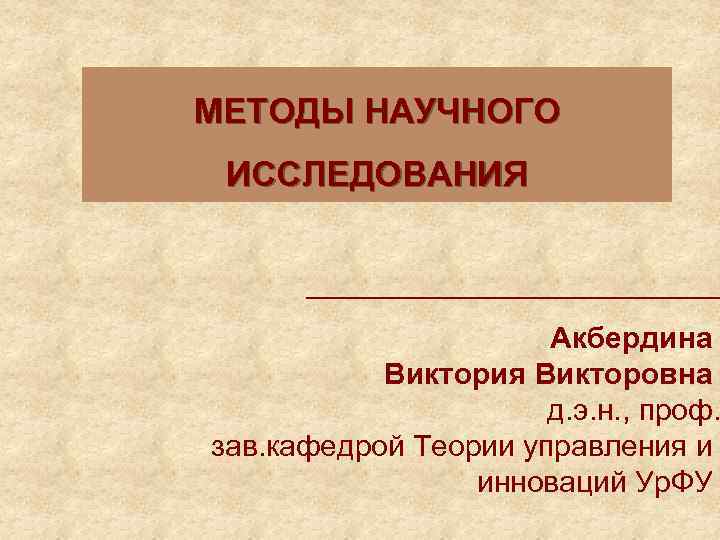 МЕТОДЫ НАУЧНОГО ИССЛЕДОВАНИЯ Акбердина Виктория Викторовна д. э. н. , проф. зав. кафедрой Теории управления и инноваций Ур. ФУ