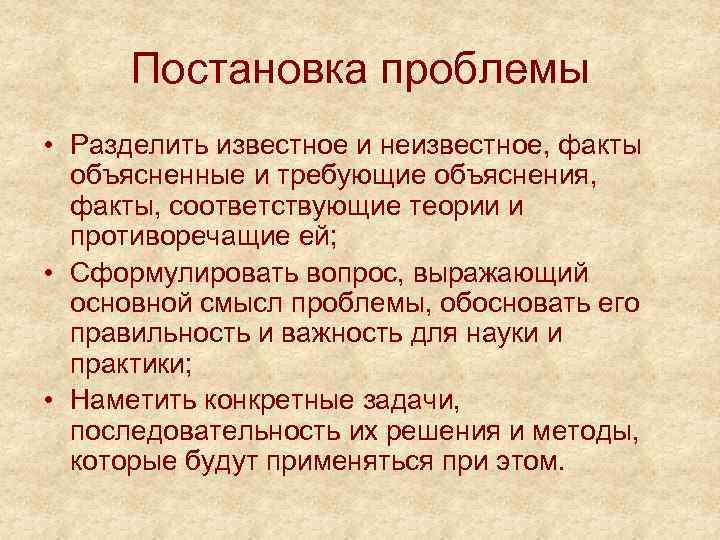 Постановка проблемы • Разделить известное и неизвестное, факты объясненные и требующие объяснения, факты, соответствующие теории и противоречащие ей; • Сформулировать вопрос, выражающий основной смысл проблемы, обосновать его правильность и важность для науки и практики; • Наметить конкретные задачи, последовательность их решения и методы, которые будут применяться при этом.