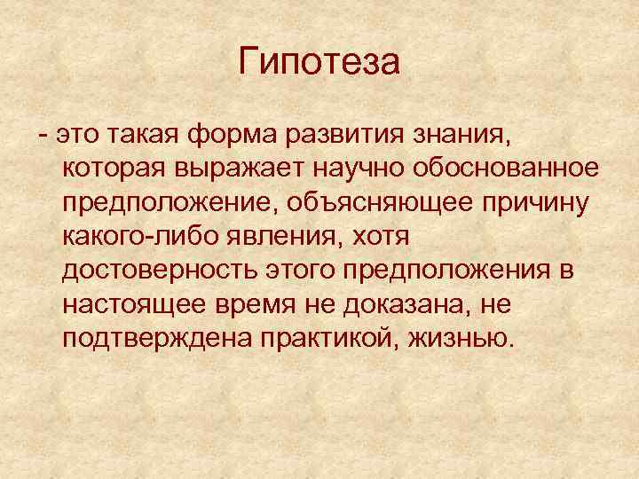 Гипотеза - это такая форма развития знания, которая выражает научно обоснованное предположение, объясняющее причину какого-либо явления, хотя достоверность этого предположения в настоящее время не доказана, не подтверждена практикой, жизнью.