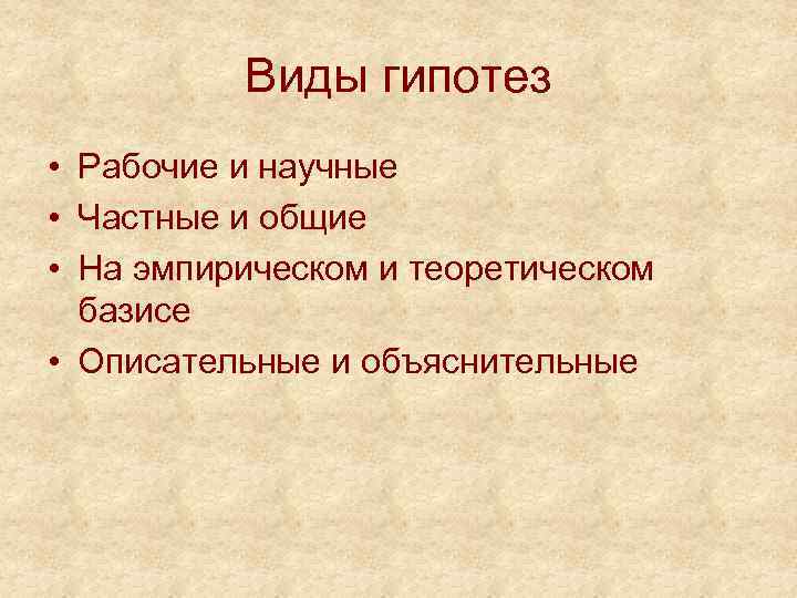 Виды гипотез • Рабочие и научные • Частные и общие • На эмпирическом и теоретическом базисе • Описательные и объяснительные