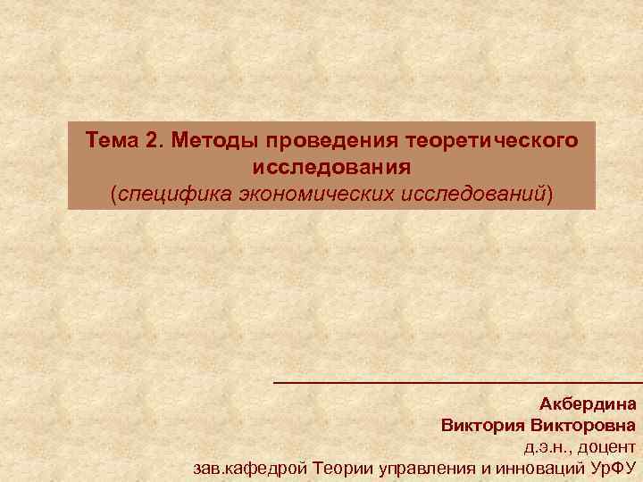 Тема 2. Методы проведения теоретического исследования (специфика экономических исследований) Акбердина Виктория Викторовна д. э. н. , доцент зав. кафедрой Теории управления и инноваций Ур. ФУ
