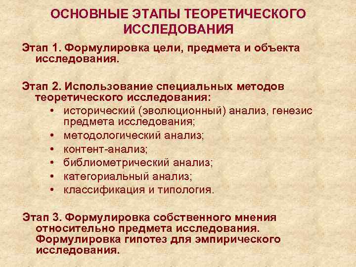 ОСНОВНЫЕ ЭТАПЫ ТЕОРЕТИЧЕСКОГО ИССЛЕДОВАНИЯ Этап 1. Формулировка цели, предмета и объекта исследования. Этап 2. Использование специальных методов теоретического исследования: • исторический (эволюционный) анализ, генезис предмета исследования; • методологический анализ; • контент-анализ; • библиометрический анализ; • категориальный анализ; • классификация и типология. Этап 3. Формулировка собственного мнения относительно предмета исследования. Формулировка гипотез для эмпирического исследования.