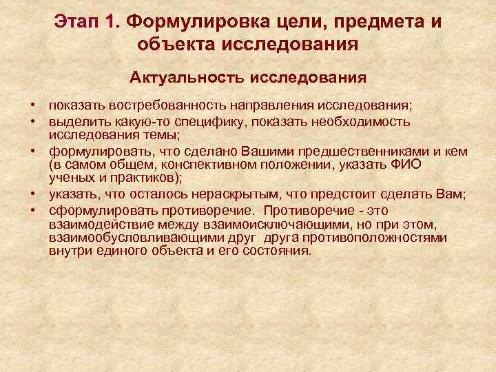 Этап 1. Формулировка цели, предмета и объекта исследования Актуальность исследования • показать востребованность направления исследования; • выделить какую-то специфику, показать необходимость исследования темы; • формулировать, что сделано Вашими предшественниками и кем (в самом общем, конспективном положении, указать ФИО ученых и практиков); • указать, что осталось нераскрытым, что предстоит сделать Вам; • сформулировать противоречие. Противоречие - это взаимодействие между взаимоисключающими, но при этом, взаимообусловливающими друга противоположностями внутри единого объекта и его состояния.