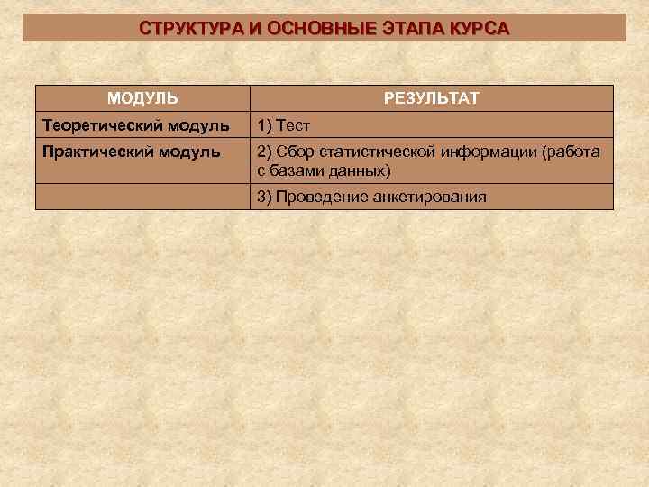 СТРУКТУРА И ОСНОВНЫЕ ЭТАПА КУРСА МОДУЛЬ РЕЗУЛЬТАТ Теоретический модуль 1) Тест Практический модуль 2) Сбор статистической информации (работа с базами данных) 3) Проведение анкетирования