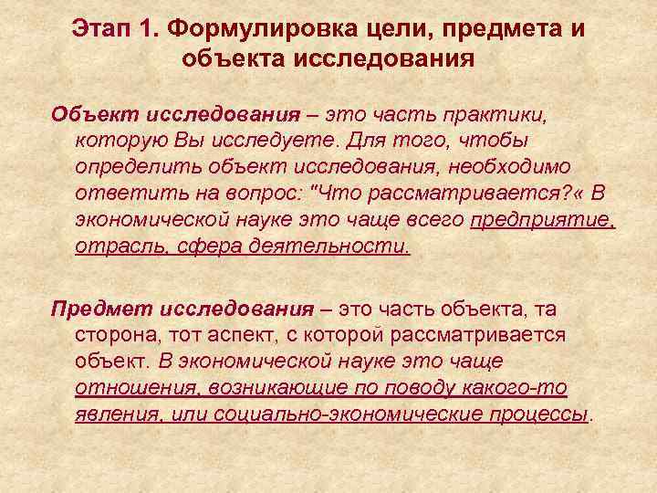 Этап 1. Формулировка цели, предмета и объекта исследования Объект исследования – это часть практики, которую Вы исследуете. Для того, чтобы определить объект исследования, необходимо ответить на вопрос: "Что рассматривается? « В экономической науке это чаще всего предприятие, отрасль, сфера деятельности. Предмет исследования – это часть объекта, та сторона, тот аспект, с которой рассматривается объект. В экономической науке это чаще отношения, возникающие по поводу какого-то явления, или социально-экономические процессы.