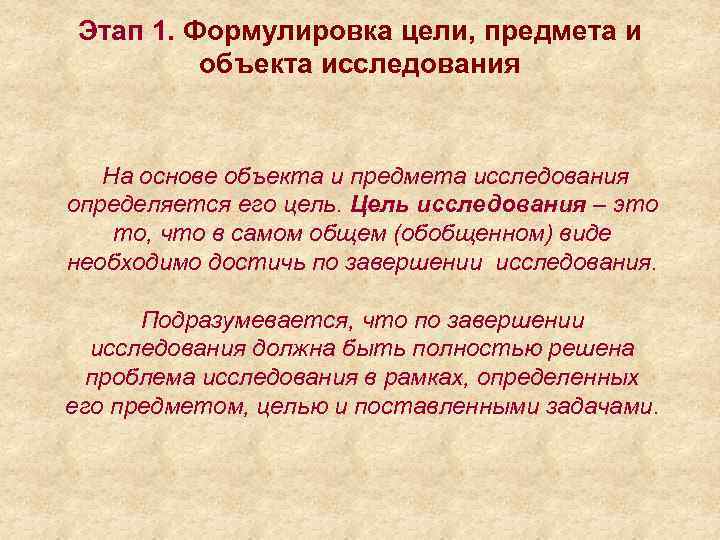 Этап 1. Формулировка цели, предмета и объекта исследования На основе объекта и предмета исследования определяется его цель. Цель исследования – это то, что в самом общем (обобщенном) виде необходимо достичь по завершении исследования. Подразумевается, что по завершении исследования должна быть полностью решена проблема исследования в рамках, определенных его предметом, целью и поставленными задачами.