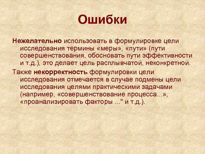Ошибки Нежелательно использовать в формулировке цели исследования термины «меры» , «пути» (пути совершенствования, обосновать пути эффективности и т. д. ), это делает цель расплывчатой, неконкретной. Также некорректность формулировки цели исследования отмечается в случае подмены цели исследования целями практическими задачами (например, «совершенствование процесса. . . » , «проанализировать факторы. . . " и т. д. ).
