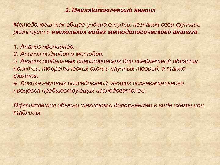2. Методологический анализ Методология как общее учение о путях познания свои функции реализует в нескольких видах методологического анализа. 1. Анализ принципов. 2. Анализ подходов и методов. 3. Анализ отдельных специфических для предметной области понятий, теоретических схем и научных теорий, а также фактов. 4. Логика научных исследований, анализ познавательного процесса предшествующих исследователей. Оформляется обычно текстом с дополнением в виде схемы или таблицы.