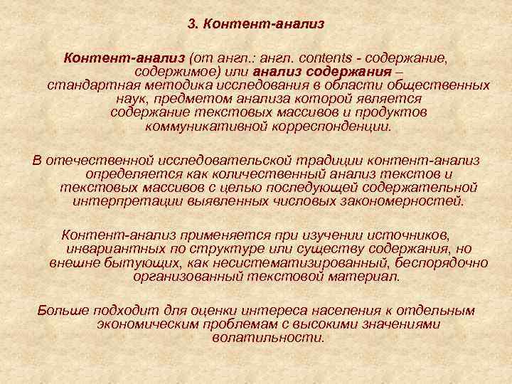 3. Контент-анализ (от англ. : англ. contents - содержание, содержимое) или анализ содержания – стандартная методика исследования в области общественных наук, предметом анализа которой является содержание текстовых массивов и продуктов коммуникативной корреспонденции. В отечественной исследовательской традиции контент-анализ определяется как количественный анализ текстов и текстовых массивов с целью последующей содержательной интерпретации выявленных числовых закономерностей. Контент-анализ применяется при изучении источников, инвариантных по структуре или существу содержания, но внешне бытующих, как несистематизированный, беспорядочно организованный текстовой материал. Больше подходит для оценки интереса населения к отдельным экономическим проблемам с высокими значениями волатильности.
