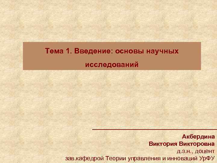Тема 1. Введение: основы научных исследований Акбердина Виктория Викторовна д. э. н. , доцент зав. кафедрой Теории управления и инноваций Ур. ФУ