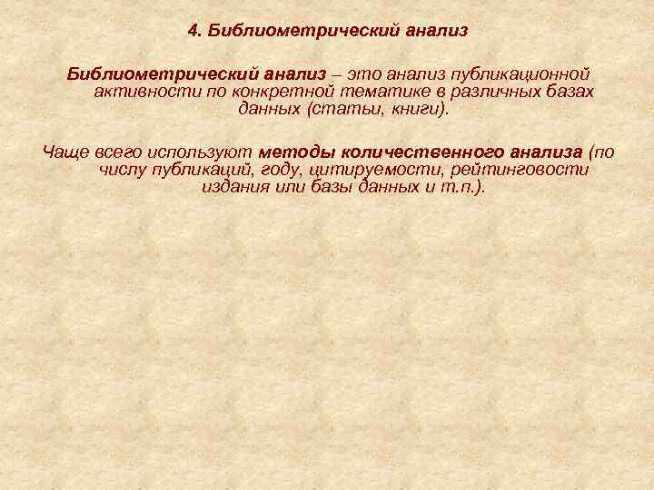 4. Библиометрический анализ – это анализ публикационной активности по конкретной тематике в различных базах данных (статьи, книги). Чаще всего используют методы количественного анализа (по числу публикаций, году, цитируемости, рейтинговости издания или базы данных и т. п. ).