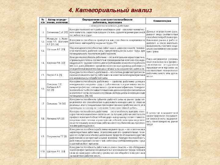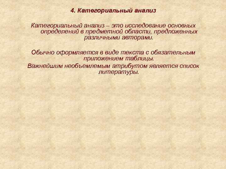 4. Категориальный анализ – это исследование основных определений в предметной области, предложенных различными авторами. Обычно оформляется в виде текста с обязательным приложением таблицы. Важнейшим необъемлемым атрибутом является список литературы.