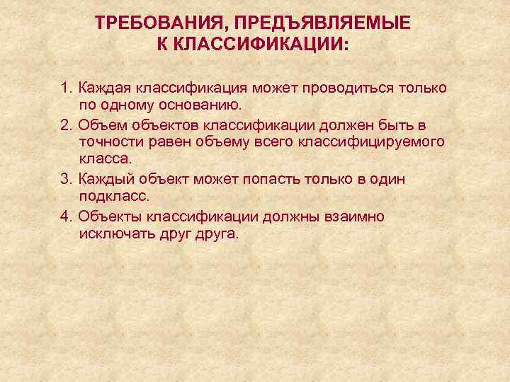 ТРЕБОВАНИЯ, ПРЕДЪЯВЛЯЕМЫЕ К КЛАССИФИКАЦИИ: 1. Каждая классификация может проводиться только по одному основанию. 2. Объем объектов классификации должен быть в точности равен объему всего классифицируемого класса. 3. Каждый объект может попасть только в один подкласс. 4. Объекты классификации должны взаимно исключать друга.