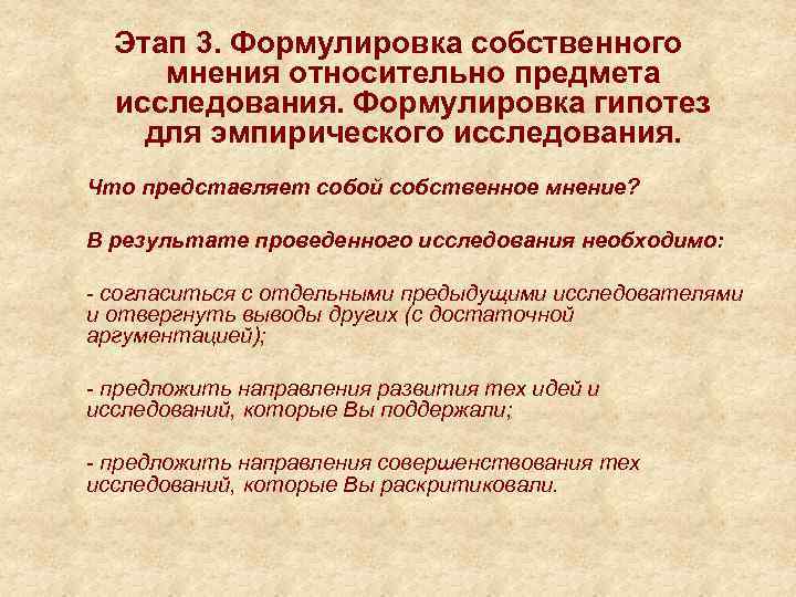 Этап 3. Формулировка собственного мнения относительно предмета исследования. Формулировка гипотез для эмпирического исследования. Что представляет собой собственное мнение? В результате проведенного исследования необходимо: - согласиться с отдельными предыдущими исследователями и отвергнуть выводы других (с достаточной аргументацией); - предложить направления развития тех идей и исследований, которые Вы поддержали; - предложить направления совершенствования тех исследований, которые Вы раскритиковали.