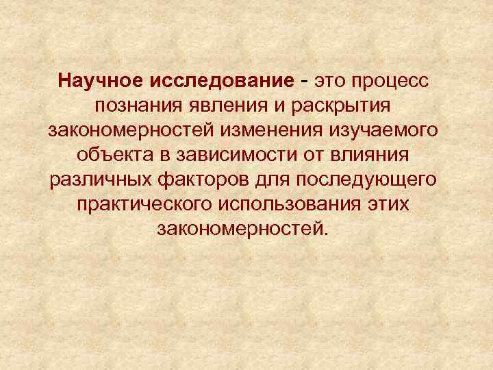 Научное исследование - это процесс познания явления и раскрытия закономерностей изменения изучаемого объекта в зависимости от влияния различных факторов для последующего практического использования этих закономерностей.