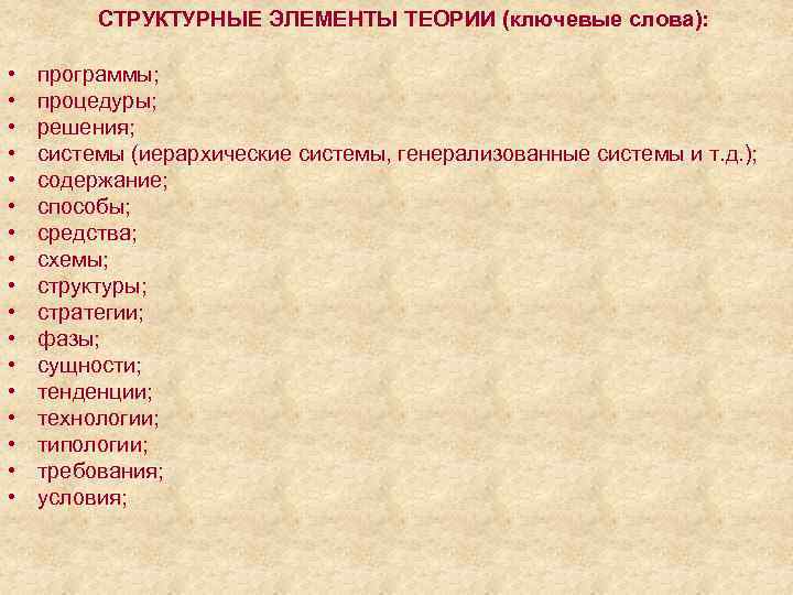 СТРУКТУРНЫЕ ЭЛЕМЕНТЫ ТЕОРИИ (ключевые слова): • • • • • программы; процедуры; решения; системы (иерархические системы, генерализованные системы и т. д. ); содержание; способы; средства; схемы; структуры; стратегии; фазы; сущности; тенденции; технологии; типологии; требования; условия;