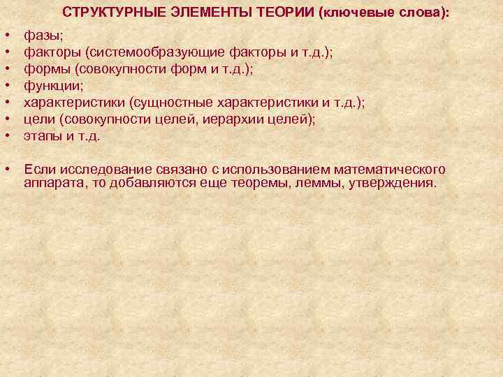 СТРУКТУРНЫЕ ЭЛЕМЕНТЫ ТЕОРИИ (ключевые слова): • • фазы; факторы (системообразующие факторы и т. д. ); формы (совокупности форм и т. д. ); функции; характеристики (сущностные характеристики и т. д. ); цели (совокупности целей, иерархии целей); этапы и т. д. • Если исследование связано с использованием математического аппарата, то добавляются еще теоремы, леммы, утверждения.