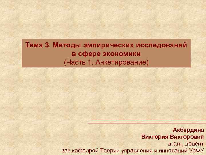 Тема 3. Методы эмпирических исследований в сфере экономики (Часть 1. Анкетирование) Акбердина Виктория Викторовна д. э. н. , доцент зав. кафедрой Теории управления и инноваций Ур. ФУ