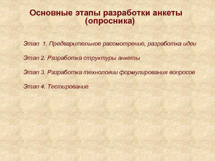 Основные этапы разработки анкеты (опросника) Этап 1. Предварительное рассмотрение, разработка идеи Этап 2. Разработка структуры анкеты Этап 3. Разработка технологии формулирования вопросов Этап 4. Тестирование