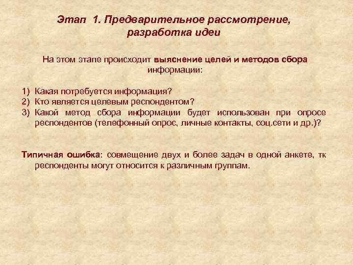 Этап 1. Предварительное рассмотрение, разработка идеи На этом этапе происходит выяснение целей и методов сбора информации: 1) Какая потребуется информация? 2) Кто является целевым респондентом? 3) Какой метод сбора информации будет использован при опросе респондентов (телефонный опрос, личные контакты, соц. сети и др. )? Типичная ошибка: совмещение двух и более задач в одной анкете, тк респонденты могут относится к различным группам.