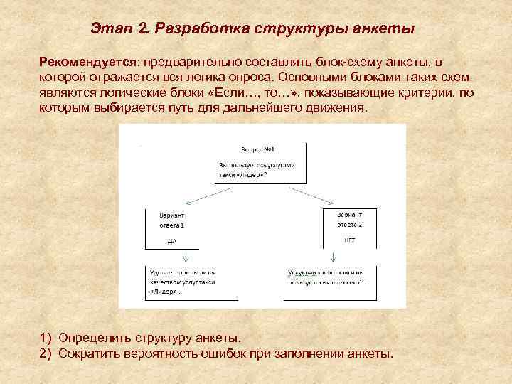 Этап 2. Разработка структуры анкеты Рекомендуется: предварительно составлять блок-схему анкеты, в которой отражается вся логика опроса. Основными блоками таких схем являются логические блоки «Если…, то…» , показывающие критерии, по которым выбирается путь для дальнейшего движения. 1) Определить структуру анкеты. 2) Сократить вероятность ошибок при заполнении анкеты.