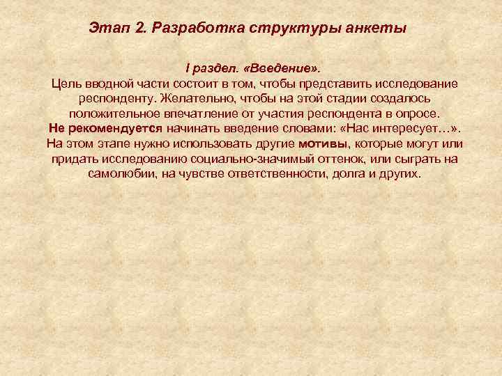 Этап 2. Разработка структуры анкеты I раздел. «Введение» . Цель вводной части состоит в том, чтобы представить исследование респонденту. Желательно, чтобы на этой стадии создалось положительное впечатление от участия респондента в опросе. Не рекомендуется начинать введение словами: «Нас интересует…» . На этом этапе нужно использовать другие мотивы, которые могут или придать исследованию социально-значимый оттенок, или сыграть на самолюбии, на чувстве ответственности, долга и других.