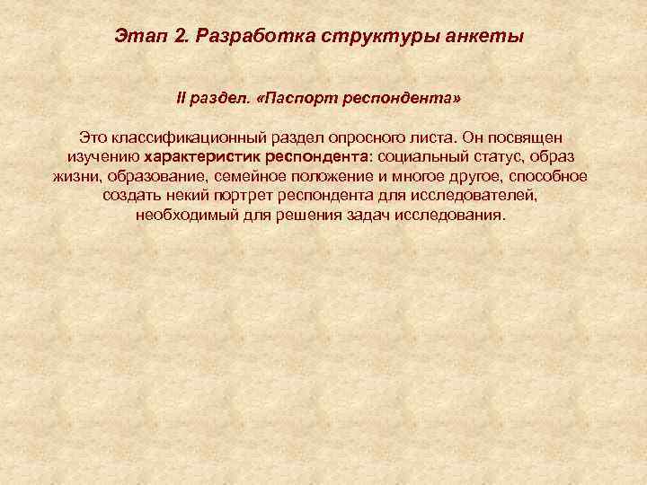 Этап 2. Разработка структуры анкеты II раздел. «Паспорт респондента» Это классификационный раздел опросного листа. Он посвящен изучению характеристик респондента: социальный статус, образ жизни, образование, семейное положение и многое другое, способное создать некий портрет респондента для исследователей, необходимый для решения задач исследования.