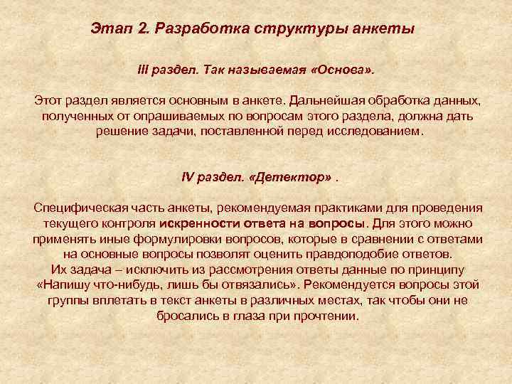 Этап 2. Разработка структуры анкеты III раздел. Так называемая «Основа» . Этот раздел является основным в анкете. Дальнейшая обработка данных, полученных от опрашиваемых по вопросам этого раздела, должна дать решение задачи, поставленной перед исследованием. IV раздел. «Детектор» . Специфическая часть анкеты, рекомендуемая практиками для проведения текущего контроля искренности ответа на вопросы. Для этого можно применять иные формулировки вопросов, которые в сравнении с ответами на основные вопросы позволят оценить правдоподобие ответов. Их задача – исключить из рассмотрения ответы данные по принципу «Напишу что-нибудь, лишь бы отвязались» . Рекомендуется вопросы этой группы вплетать в текст анкеты в различных местах, так чтобы они не бросались в глаза при прочтении.