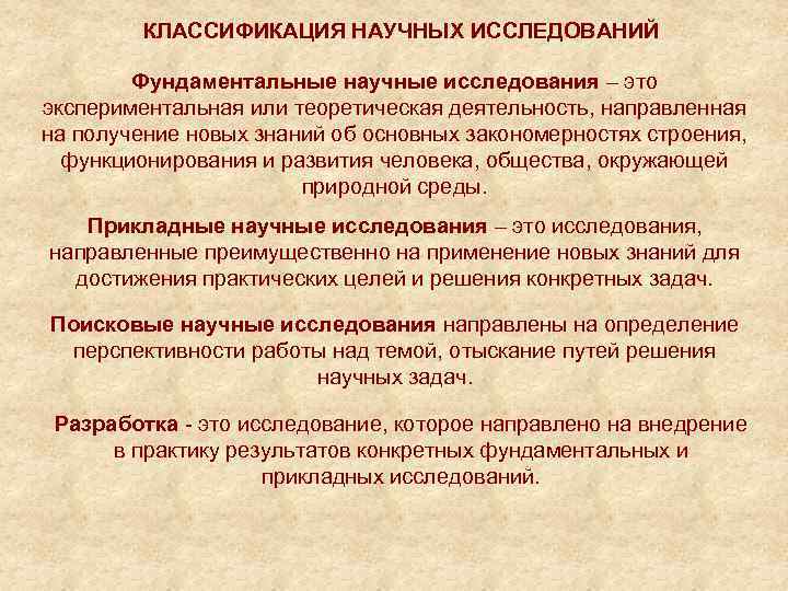 КЛАССИФИКАЦИЯ НАУЧНЫХ ИССЛЕДОВАНИЙ Фундаментальные научные исследования – это экспериментальная или теоретическая деятельность, направленная на получение новых знаний об основных закономерностях строения, функционирования и развития человека, общества, окружающей природной среды. Прикладные научные исследования – это исследования, направленные преимущественно на применение новых знаний для достижения практических целей и решения конкретных задач. Поисковые научные исследования направлены на определение перспективности работы над темой, отыскание путей решения научных задач. Разработка - это исследование, которое направлено на внедрение в практику результатов конкретных фундаментальных и прикладных исследований.