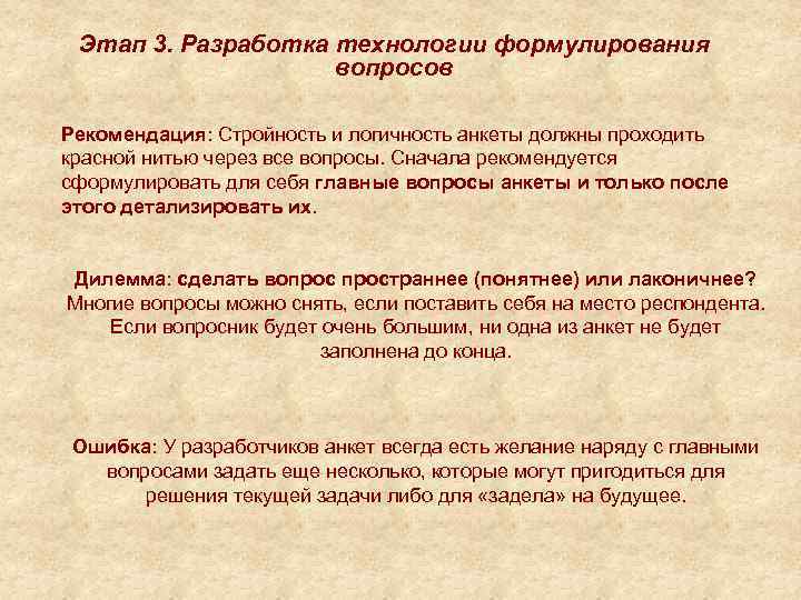 Этап 3. Разработка технологии формулирования вопросов Рекомендация: Стройность и логичность анкеты должны проходить красной нитью через все вопросы. Сначала рекомендуется сформулировать для себя главные вопросы анкеты и только после этого детализировать их. Дилемма: сделать вопространнее (понятнее) или лаконичнее? Многие вопросы можно снять, если поставить себя на место респондента. Если вопросник будет очень большим, ни одна из анкет не будет заполнена до конца. Ошибка: У разработчиков анкет всегда есть желание наряду с главными вопросами задать еще несколько, которые могут пригодиться для решения текущей задачи либо для «задела» на будущее.