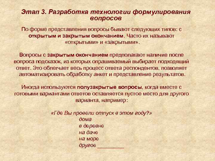 Этап 3. Разработка технологии формулирования вопросов По форме представления вопросы бывают следующих типов: с открытым и закрытым окончанием. Часто их называют «открытыми» и «закрытыми» . Вопросы с закрытым окончанием предполагают наличие после вопроса подсказок, из которых опрашиваемый выбирает подходящий ответ. Это облегчает весь процесс ответа респондентов, позволяет автоматизировать обработку анкет и представление результатов. Иногда используются полузакрытые вопросы, когда вместе с готовыми вариантами ответов оставляется пустое место для другого варианта, например: «Где Вы провели отпуск в этом году? » дома в деревне на даче на море другое _____