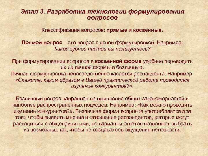 Этап 3. Разработка технологии формулирования вопросов Классификация вопросов: прямые и косвенные. Прямой вопрос – это вопрос с ясной формулировкой. Например: Какой зубной пастой вы пользуетесь? При формулировании вопросов в косвенной форме удобнее переводить их из личной формы в безличную. Личная формулировка непосредственно касается респондента. Например: «Скажите, каким образом в Вашей практической работе проводится изучение конкурентов? » . Безличный вопрос направлен на выявление общих закономерностей и наиболее распространенных подходов. Например: «Как можно проводить изучение конкурентов? » . Безличная форма вопросов употребляется для того, чтобы выявить мнения и отношения респондентов, которые могут расходиться с общепринятыми, но варианты ответов позволяют выбрать из возможных так, чтобы не создавалось ощущения неловкости.