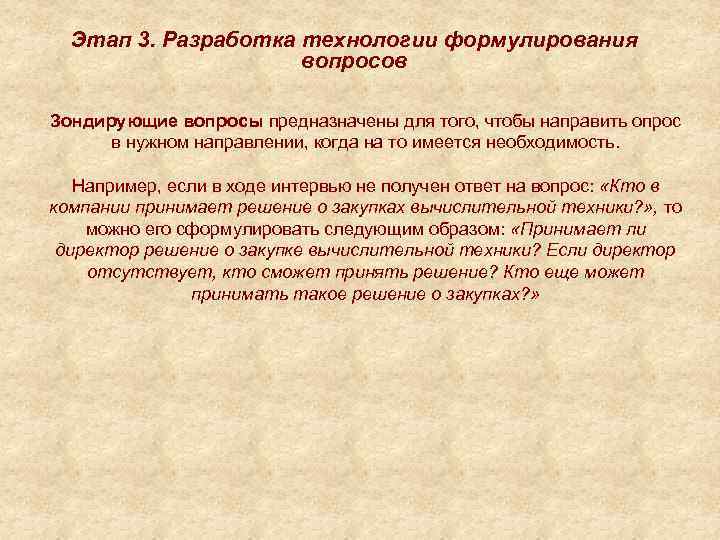 Этап 3. Разработка технологии формулирования вопросов Зондирующие вопросы предназначены для того, чтобы направить опрос в нужном направлении, когда на то имеется необходимость. Например, если в ходе интервью не получен ответ на вопрос: «Кто в компании принимает решение о закупках вычислительной техники? » , то можно его сформулировать следующим образом: «Принимает ли директор решение о закупке вычислительной техники? Если директор отсутствует, кто сможет принять решение? Кто еще может принимать такое решение о закупках? »