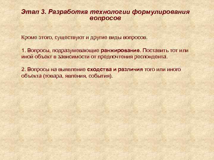Этап 3. Разработка технологии формулирования вопросов Кроме этого, существуют и другие виды вопросов. 1. Вопросы, подразумевающие ранжирование. Поставить тот или иной объект в зависимости от предпочтения респондента. 2. Вопросы на выявление сходства и различия того или иного объекта (товара, явления, события).
