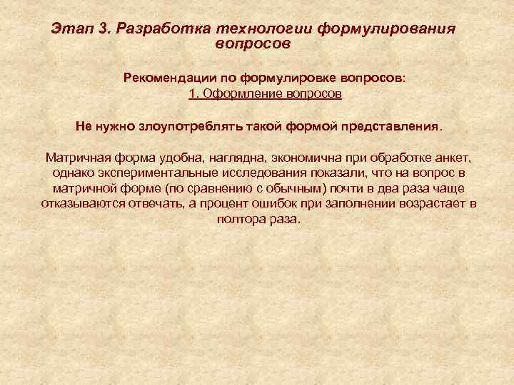 Этап 3. Разработка технологии формулирования вопросов Рекомендации по формулировке вопросов: 1. Оформление вопросов Не нужно злоупотреблять такой формой представления. Матричная форма удобна, наглядна, экономична при обработке анкет, однако экспериментальные исследования показали, что на вопрос в матричной форме (по сравнению с обычным) почти в два раза чаще отказываются отвечать, а процент ошибок при заполнении возрастает в полтора раза.