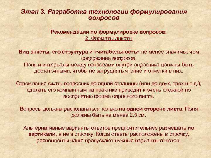 Этап 3. Разработка технологии формулирования вопросов Рекомендации по формулировке вопросов: 2. Форматы анкеты Вид анкеты, его структура и «читабельность» не менее значимы, чем содержание вопросов. Поля и интервалы между вопросами внутри опросника должны быть достаточными, чтобы не затруднять чтение и отметки в них. Стремление сжать вопросник до одной страницы (или до двух, трех и т. д. ), сделать его компактным на практике приводит к очень сложной по восприятию форме опросного листа. Вопросы должны располагаться только на одной стороне листа. Поля должны быть не менее 2, 5 см. Альтернативные варианты ответов предпочтительнее размещать по вертикали, а не в строчку. Когда ответы расположены в строчку, респонденты чаще пропускают нужные варианты ответов.